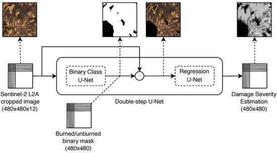 One of the main contributions of this study is the modification of the original U-Net, empowering its ability to distinguish between ordered classes, as in the case of damage severity. The classical U-Net was proposed for solving a segmentation task, being able to identify a specified entity in an image. Therefore, it is able to recognize relations and features (i.e., borders and gradients) among the pixel values belonging to the searched entity. Conversely, in the context of this work, the goal appears to be more complex and it can be split into two sub-tasks: (i) to identify areas affected by fire, and (ii) to determine damage severity in the burned areas. In the first sub-task, the goal is to distinguish burned areas from unburned regions, like in a classical segmentation task (classification task). The second sub-task takes into account the areas affected by the fire and discriminates between four consequent levels the severity of the damage (regression task). The two sub-tasks are solved with two different building blocks: the “Binary Classification U-Net” and the “Regression U-Net”. In both the building blocks, the output map is a matrix of dimensions 480 × 480, where each element refers to the pixel at the same position of the input tile. In the proposed solution, the two building blocks are combined together to outperform the prediction quality of the approach based only on the Regression U-Net block.