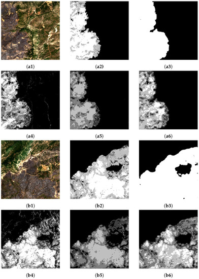 Wildfire severity level predictions. The severity levels range from black (severity 0) to white (severity 4). (a1,b1) Sentinel L2A acquisition; (a2,b2) Copernicus EMS grading map (GT); (a3,b3) Binary mask generated by the Binary U-Net: black and white colors indicate unburned and burned regions, respectively; (a4,b4) Thresholded dNBR, obtained from pre and post-fire acquisitions; (a5,b5) Single U-Net prediction; (a6,b6) Double-Step U-Net prediction.
