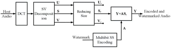 Hua inserted b as the additional operation to after multiplying by . In this paper, we embed the watermark bits into the over-complete matrix . Then, we multiply by the diagonal matrix from the singular values of the host audio.