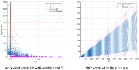 Figure 3a displays the payload versus CR with and . All possibilities of the r and M combination with the restriction (47) are plotted as the magenta dots in Figure 3b. Blue dots in Figure 3a mean the mapping between the payload using Equation (17) and CR using Equation (6) where , whereas magenta plus signs mean the mapping between the payload and CR where . The red vertical dotted line means the minimum CR or one. The green horizontal dashed line means the minimum payload or 20 bps []. Thus, the area with feasible payload and CR is the right side of the red vertical dotted line and the top side of the green horizontal dashed line. We see that many blue dots have a higher payload and CR than the magenta plus signs, which means the payload and CR with have many possibilities to reach much higher ones than the payload and CR with . The payload and CR mapping displayed in the blue dots where payload > 20 bps and CR > 1 in Figure 3a are obtained from r and M in the blue circle in Figure 3b; thus, we set for the experiment in the next section where the r and M combination values are selected from the blue circle in Figure 3b.