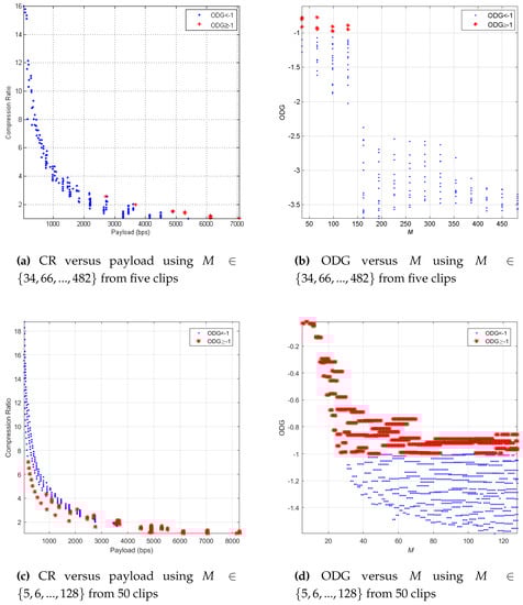 From Section 3.6, we selected M and r values to obtain CR > 1 and payload > 20 bps using as displayed in Figure 3b with the blue circle symbol. Using the selected M and r from and , we applied the simulation onto five clips as the hosts. The simulation consisted of the embedding process, the data detection process, and the audio reconstruction process. It calculated the BER between the detected watermark and the original watermark, and it finally calculated the audio quality from the reconstructed audio in the ODG performance parameter. The simulation results are displayed in Figure 4a,b. From the simulation using all combinations of parameters M and r with five clips, we obtained a perfect watermark detected without any errors or BER = 0 on average. Figure 4a shows the trade-off relation between CR and payload with a negative exponential relation. Red star symbols mean the mapping between CR and payload with ODG ≥−1, while blue dot symbols mean the mapping between CR and payload with ODG < −1. We also plot the blue dots and the red stars in Figure 4b, in the relation between ODG and M. We can say that the longer the length of audio processed for embedding and compression, the worse the reconstructed audio quality. For the above case with five selected clips, good reconstructed audio quality or ODG≥−1 was obtained when M < 128 samples with certain values of r.