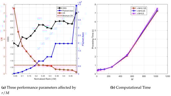 We applied the simulation using 50 clips with and , which was similar to , to see how the audio truncation affected the performance parameters. Figure 5a displays the simulation result. This case also produced a perfect detected watermark or BER = 0 on average. Three performance parameters, i.e., ODG, CR, and payload as the y-axis, are displayed in one figure after being averaged, and the x-axis is the normalized rank or . The black line with the right triangle symbol shows the average ODG producing −1.16 to −0.16. The blue line with a square symbol shows the payload of an embedded watermark in bps, obtaining 172.26 to 44,100 bps. The red line with a circle symbol means the CR of the encoded audio resulting from 0.20 to 7.53. The red horizontal line with the dashed-dotted symbol means the minimum CR or CR = 1. We can see that increasing the normalized rank represented by raised the ODG and the watermark payload, but lowered the CR of encoded audio. If the CR with the red line and circle symbol was less than the minimum CR, then it meant the CS process did not compress the audio signal overall; instead, it increased the length of the encoded signal. In this case, we could select the normalized rank less than 0.2 or to maintain the CR to be more than one. In more detail, we could limit the minimum such that ODG > −1, i.e., . Thus, the selected range of normalized rank was , obtaining the watermark payload with the range bps, the compressed ratio with the range , and ODG with the range . The restriction for this case maintained good quality of the reconstructed audio with a high payload and CR > 1.