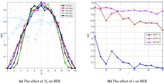In Section 3.3, there were two parameters having an impact on the model security, i.e., as the number of the generated integer random permutation value and r as the row and column number of the diagonal matrix after being truncated, . The original Hadamard matrix is denoted as , and the secured Hadamard matrix is denoted as . We applied the simulation varying r and to understand how much r and affected the security performance. In the real situation, one can try to break the security model by using the original Hadamard matrix for detecting the watermark and reconstructing the audio due to the simplicity of the Hadamard matrix generation. With the secured Hadamard matrix in the encoder, we applied the decoding by the original Hadamard matrix to analyze the strength of the security model. If the security model worked well, the detection watermark should ideally be damaged, or the BER should be near 0.5.
