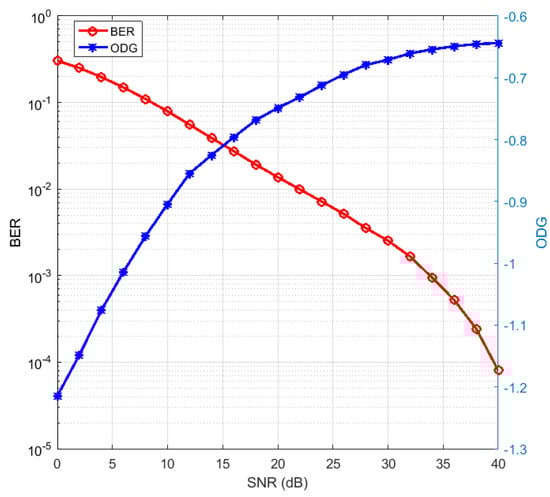 In the noisy environment, our proposed method was robust to additive noise attack as confirmed mathematically in Section 3.5. Nevertheless, it was necessary to know how robust the method was if the additive noise attacks the encoded audio by simulation. We analyzed the detected watermark quality represented by BER and the reconstructed audio quality represented by ODG as two performance parameters affected by the additive noise. In the simulation, we used 50 clips with 50 iterations for each clip, , , and . The additive noise parameter or the input parameter for the simulation was SNR, as described in (45), whose range was 0 to 40 dB. ODG and BER as the performance parameters obtained were averaged, as displayed in Figure 7. Decreasing the noise power or increasing the SNR rose the reconstructed audio quality or ODG and the detected watermark quality or BER.