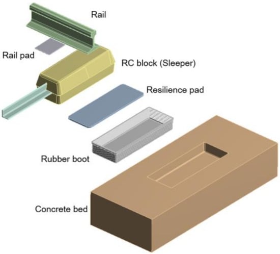 Elements of a slab-track structure are depicted in Figure 1. It is necessary to install rail pads for concrete sleepers on ballast, as the sleeper would otherwise break or shatter under moving-rain loads. Although the ballast and formation do afford some track elasticity, this is not sufficient to save a concrete sleeper. It is agreed that slab tracks are far stiffer when compared to traditional track designs. Finally, all concrete sleepers are constructed using high-strength concrete construction. At present, most of the domestic urban railways are slab tracks, and track support stiffness, an important factor that directly affects the performance of slab tracks, is determined using the spring stiffness of elastic materials such as rail pads and resilience pads [2,3,4]. Therefore, aging elastic material can increase the dynamic wheel-rail impact force and vibration transmitted to the track structure, including the rails, which can lead to reduced ride comfort, civil complaints, and damage and deterioration of the track components [2,5,6,7]. Resilience pads can lose their function as elastic materials because fatigue is accumulated with aging (deterioration), and elasticity is lost as a result [8,9,10]. Therefore, maintenance by means of timely evaluation and replacement of elastic materials is critical [2].