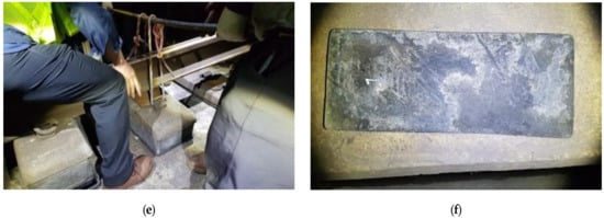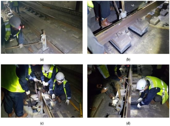 Presently, the maintenance of elastic slab-track materials is performed by collecting resilience pads from various sites through an overnight rack work, and subsequently, an accredited laboratory, such as the Seoul Metro, is requested to perform a spring-stiffness test on the collected resilience pad. The performance of the elastic material is then estimated, based on the load–displacement test result, and is used to determine the elastic material should be employed or discarded [11,12,13,14]. However, this requires an expensive, dangerous, and complicated process of dismantling the rail, rail fastening, and lifting the sleepers to remove the resilience pads, as shown in Figure 2. As depicted Figure 2a,b, rail fasteners are first dismantled to remove the elastic pad, followed by lifting of sleepers. The elastic pad can be removed (Figure 2c), replaced with a new elastic pad (Figure 2d), and reassembled (Figure 2e) prior to sleepers being put down, Figure 2f depicts a used resilience-pad sample.