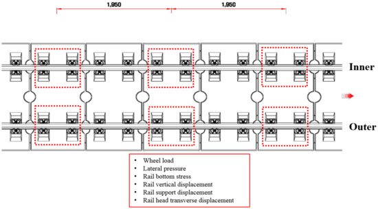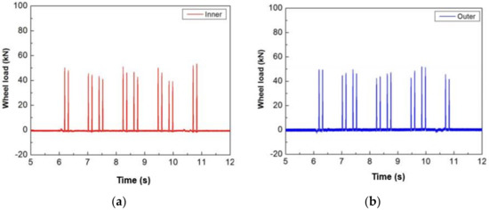 Figure 5 and Figure 6 show the results of the wheel load and vertical rail displacements measured using the wheel load sensors and the displacement meter.