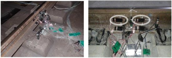 The location of sensor installation is shown in Figure 3. As a method for evaluating the current track support stiffness, a field measurement is performed, as shown in Figure 4 [2]. In this study, a straight track section was selected for performing track-support stiffness measurements. The speed and axial load of the train equaled 100 km/h and 160 kN, respectively. As the field measurement is a field test of the railway track in a serviced line, it should be performed in the field during the nightly train cut-off time to install a wheel load sensor and a displacement meter and measure track behavior under the operating train load during the daytime train hours [3,4,5,15,16]. In this study, vertical rail displacements were measured using displacement transducers, such as linear variable differential transformers (LVDTs), mounted on a jig anchored to the concrete layer of the subway structure, as illustrated in Figure 4 [1]. LVDTs (CDP-25M) used in this study demonstrated a sensitivity of 500 × 10−6/mm along with 6.25-mV/V ± 0.3% rate power and 7-Hz frequency response. All displacements were measured and automatically recorded using a computer-controlled data-acquisition system. Figure 4 depicts the attachment of the wheel–load sensor to the sleeper for the evaluation of the rail deflection. Additionally, a newly developed track support stiffness (TSS) tester can be attached to the middle of the sleeper. However, field measurements in this study were performed on the sleeper to calculate the direct displacement of the elastic spring at the rail-support point.