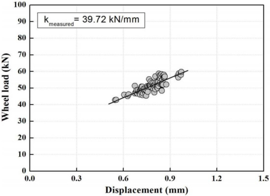 Figure 7 shows the track support stiffness calculated by measuring the dynamic wheel load and the displacement of the rail or sleeper through field measurements. Figure 7 shows the load displacement diagram based on Figure 5 and Figure 6. It is difficult to perform field measurements at multiple locations owing to the small time window available (approximately 3.5 h). In addition, technical limitations are encountered when reflecting site conditions as a means for grasping the performance of certain sections using measurement data acquired at specific locations [2]. In the slab-track case, the displacement transducer was mounted on the upper surface of the slab track assuming the slab layer to remain non-deformed when subjected to a moving-train load [1]. By measuring the vertical displacement of tracks subject to moving-train loads, the effect of dynamic loading on track sections can be evaluated to calculate the track-support stiffness [1]. Although both vertical and lateral displacements were measured during on-field testing, only the vertical displacement was used in track-support-stiffness calculations [1]. Furthermore, using conventional field measurements, the track-support stiffness can be calculated by measuring the dynamic wheel load and displacement of the rail or sleeper. Based on this calculation, the spring stiffness of the resilience pad installed on the lower rail or sleeper can be determined [2,3,4,5,15]. Therefore, the purpose of evaluating track support stiffness through field measurements and inferring the level of spring stiffness change in the resilience pads in use was to evaluate track support stiffness; however, only the performance at specific positions could be analyzed [5,15,17]. In addition, the field measurement or laboratory test and analysis of the adequacy of the track support stiffness had to be differentiated. Thus, a disadvantage in the measurement system was realized in that it was not possible to directly determine the aging level of the elastic material in the field.