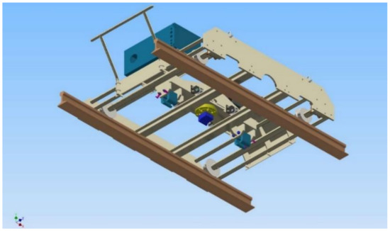 As shown in Figure 14d, the mobile bogie frame is composed of a hydraulic motor (Figure 14b) that applies hydraulic pressure to the actuator, a control box that controls the hydraulic pressure and communicates wirelessly with the tablet PC, and a mobile bogie that can be placed on all these devices and the body frame [1]. The TSS tester weighs lesser than 8.896 kN; however, only components depicted in Figure 14a–c are considered as loads, and the bogie frame (Figure 14d) is exempted from this consideration. Thus, the total load value equals less than 0.588 kN. The track support stiffness TSS tester in this study combined with the body frame part and the mobile bogie jig is as shown in Figure 15 [2].