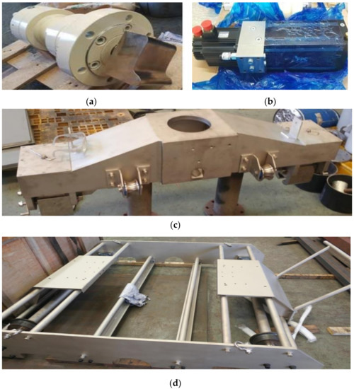 Photograph of TSS tester components. (a) Actuator and wheel jig; (b) Hydraulic motor; (c) Body frame; (d) Bogie frame.