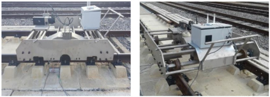 Figure 14 shows the manufacturing view of the equipment accessories constituting the track support stiffness TSS tester [2]. The actuator with wheel rig (Figure 14a) that was the load–displacement measuring system was embedded in the center hole of body frame (Figure 14c). The body frame has two specially designed grip-type fixing points that can be fixed to the field rails an easily-removable pin in case of an emergency as is in a single system and, the frame comprises of a roller-type lateral movable fixing device for freely moving the left and right rails on the mobile bogie jig as shown in Figure 14c.