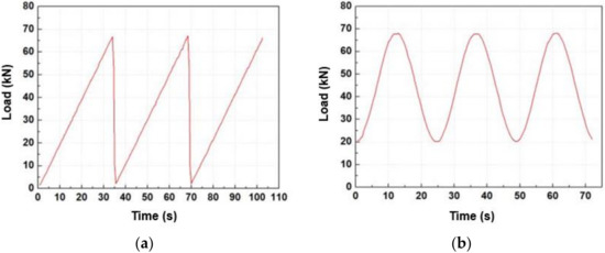 The load was applied to the top surface of the rail through the wheel-shaped jig installed in the actuator. The loading test was performed by inputting static and dynamic loads, and the load and displacement measurement data acquired by the actuator sensor were collected remotely using a tablet PC. The maximum load was tested in the range of 1–68 kN considering the capacity of actuator and the Korean standard of the rail fastening system performance test (KRS TR 0014-15 (R)) [11]. The load waveform measured was shown in Figure 17 [2]. Load values in the 0–90 kN range could be applied. Accordingly, a 68-kN load was considered in this study based on KRS. The applied dynamic load was coupled with a positive load measuring at least 20 kN. Figure 18b describes the load–displacement result obtained for 5-Hz loading frequency, whereas Figure 17b describes a sinusoidal loading trend.