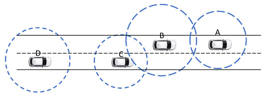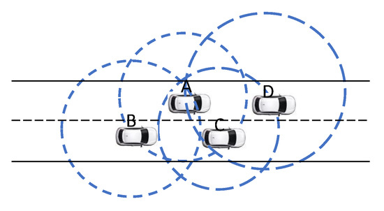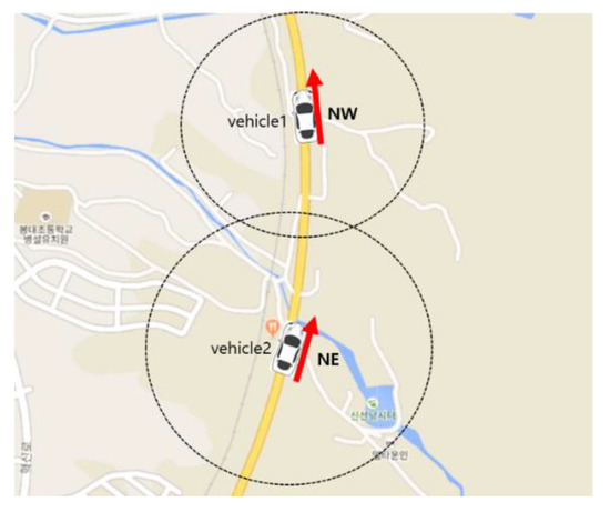 Although the connected car technology is applicable to future autonomous vehicles and smart cars, it does not apply to vehicles that are currently being produced [4,10]. If this technology is to be applicable to existing vehicles, it will require the attachment of additional devices such as an on-board unit (OBU). To prevent accidents, Advanced Driver Assistance Systems (ADAS) installed on existing vehicles are not optimum systems for the driver, and they provide neither the connected car technology nor self-driving [31]. Even if a vehicle is equipped with the Autonomous Emergency Braking (AEB) system, the vehicle will automatically apply the emergency brakes when other vehicles driving around the vehicle overtake and intervene. In this case, vehicles that immediately follow may cause a collision. Therefore, it is also important to understand the situation information of other vehicles that are currently driving around a vehicle. Hence, it is necessary to form a connected car subgroup.