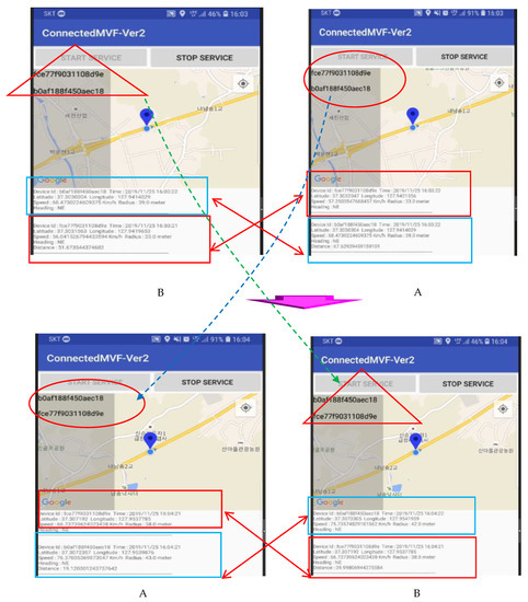 After a certain period, the two screens depicted on the top in Figure 5 show that vehicle B (device-Id: b0af188f450aec18) is increasing to form a connected group with vehicle A (device-Id: fce77f9031108d9e). In other words, while the speed of vehicle B in Figure 3 is approximately 58.26 km/h at 16:03:07, it increased to approximately 68.47 km/h at 16:03:22, as can be seen on the bottom of Figure 5. Accordingly, the radius of the area indicating mutual awareness for communicating with other vehicles also increased from 34 to 39 m. Here, the blue and red boxes indicate the driving information of our own and other vehicles, respectively, when the two driving vehicles are connected to one other. In addition, the upper left side of each screen shows the topological sequence of each vehicle in the current connected group. In other words, the triangle in the upper left side of the screen indicates that vehicle B is geographically located behind vehicle A, whereas the circle indicates that vehicle A is driving ahead of vehicle B. Therefore, the two vehicles recognize each other’s relative positions and simultaneously gather the geographical location of one another in the connected group; this situation is conceptually expressed on the left side in Figure 6.