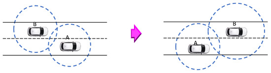 After a duration of one minute, a situation occurred wherein vehicle B increased its speed and overtook vehicle A. At this point in time, the speed of vehicle B shown at the bottom of the two screens in the lower subfigures of Figure 5 was found to increase from a value of approximately 68.47 to 75.73 km/h, and the speed of vehicle A was also found to increase from approximately 57.25 to 66.73 km/h. Therefore, the sequence of vehicles shown within the red triangles and circles in the upper left of the screens indicates that both vehicles are geographically aware that vehicle B is ahead of vehicle A. A conceptual illustration for this change in topological sequence is shown on the right side of Figure 6.