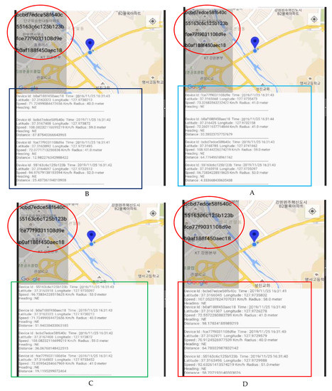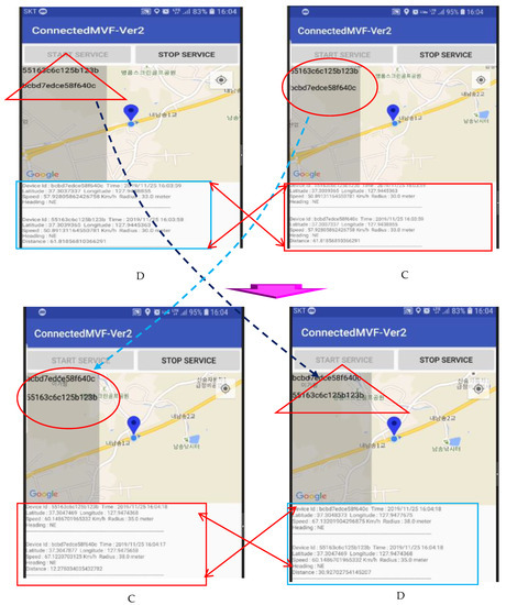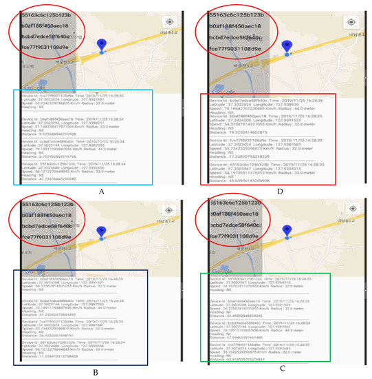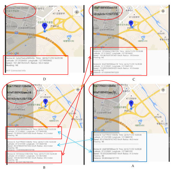 First, all the four vehicles were made to move without connecting them to one another, and the initial screen of each of the four independent CMVF clients are shown in Figure 3. In each of these screens, the shaded area on the upper left shows the topological sequence of all connected vehicles when connected, and at the bottom of the map, driving information of each vehicle such as device-ID and the current time, latitude, longitude, speed, radius as awareness range, and the heading direction is provided. In addition to these basic attributes, various other attributes such as CAM/DENM and BSM specification can also be provided, which are beyond the scope of the present work [27,28]. Furthermore, it can also be observed from Figure 4 that the topological sequence of these vehicles appear to be in the following logical sequence: B→A→D→C; however, these vehicles are not aware of each other’s relative position, as they are not connected. In addition, each dashed circle surrounding the vehicles represents the speed-reactive awareness range by the CMVF client. Outside this area, a time mismatch of roughly 1–2 s appears on the smartphone screens. This mismatch between the smartphones can be attributed to the internal time latency of the smartphones, transmission delay of the wireless mobile network, server processing latency, and so on. However, this paper considers that the absolute time of each smartphone is the same as real time.