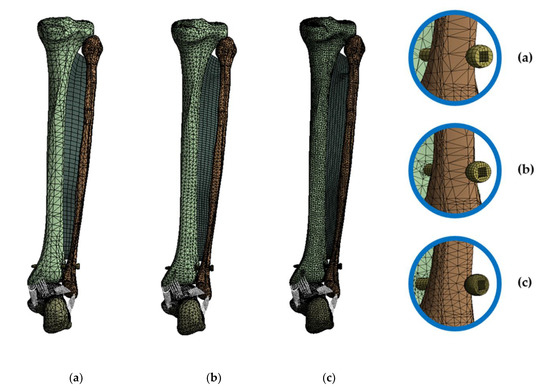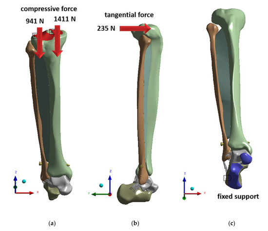 The physical motion of the lower body of a walking person is generally divided into five motions: heel strike, foot flat, midstance, heel-off, and toe-off. In this study, we selected the midstance motion for the FE models. The loads on the tibia due to the midstance motion include a compressive force of 2352 N and a tangential force of 235 N [24].