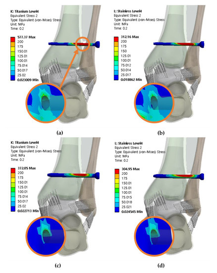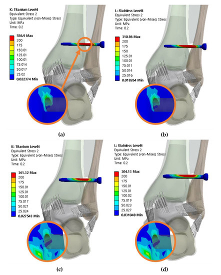 The von Mises stresses of the syndesmotic screw and adjacent bone at screw level of 25 mm with four cortical bones purchased: (a) titanium screw with a diameter of 3.5 mm, (b) stainless steel with a diameter of 3.5 mm, (c) titanium screw with a diameter of 4.5 mm, and (d) stainless steel screw with a diameter of 4.5 mm.