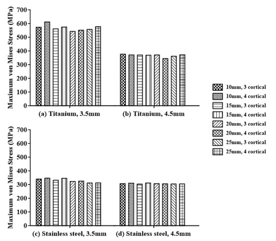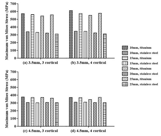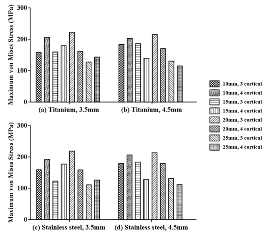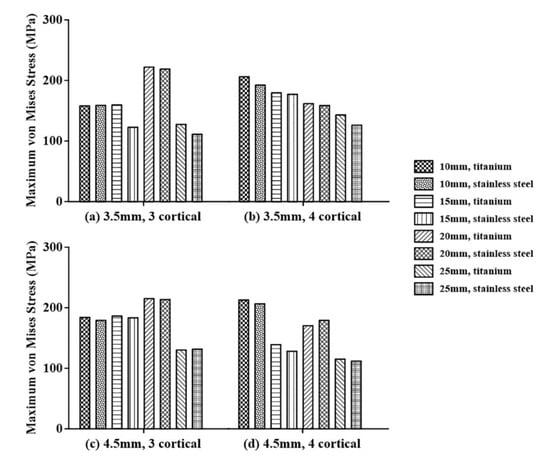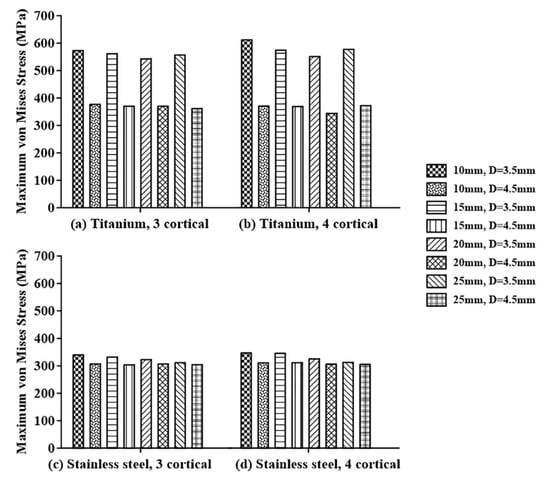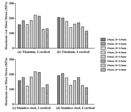 Analysis of the maximum von Mises stresses of the adjacent bone in terms of the screw material for screws with diameters of: (a) 3.5 mm penetrating three cortical bones, (b) 3.5 mm penetrating four cortical bones, (c) 4.5 mm penetrating three cortical bones, and (d) 4.5 mm penetrating four cortical bones.