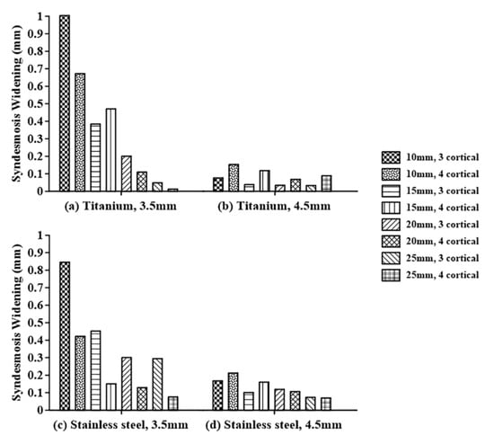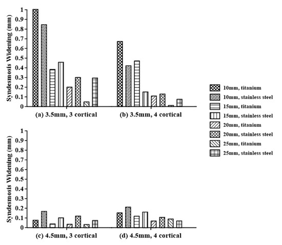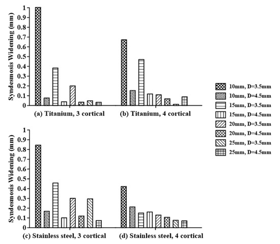 Analysis of the syndesmosis widening in terms of the screw diameter for: (a) titanium screw penetrating into three cortical bones, (b) titanium screw penetrating into four cortical bones, (c) stainless steel screw penetrating into three cortical bones, and (d) stainless steel screw penetrating into four cortical bones.