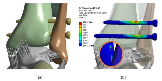 - Chen, C.; Cheng, Y.; Cheng, H.; Wen, J.; Zhao, J.; Hou, W.; Zhu, J.; Qiu, P. Finite element analysis of the stress concentration in pronation-abduction ankle joint injuries. Int. J. Clin. Exp. Med. 2017, 10, 276–284. [Google Scholar]