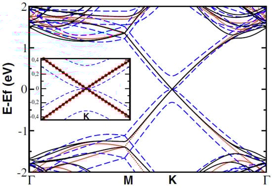 Band structure for a monolayer graphene (dotted line), a bilayer graphene with AB stacking (dashed line), and R30/R2+ rotational fault pair (single line). Band structure at the K-point is given in the inset. Reprinted with permission from Reference [23]. Copyright (2008) by American Physical Society.