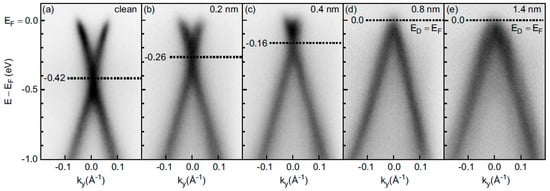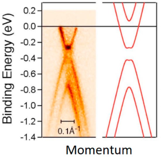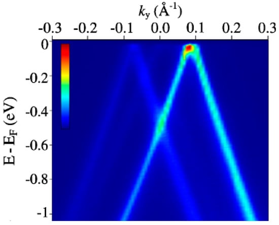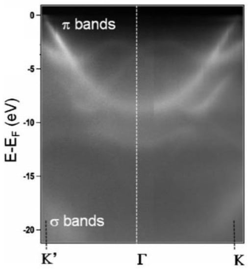 Sprinkle et al. measured the linear dispersion using ARPES, as shown in Figure 4 [35]. In the ARPES data, the linear dispersions of adjacent decoupled layers can be readily seen as well as the n-type conductivity, where EF is as low as ~14 meV, and the carrier density is ~1011 cm−2. Furthermore, the vF of MLG is close to the vF of MEG formed by thermal decomposition of the SiC(000) obtained from infra-red measurements (1.02 (±0.01) × 106 ms−1) [49] and scanning tunneling spectroscopy (1.07 (±0.01) × 106 ms−1) [50].