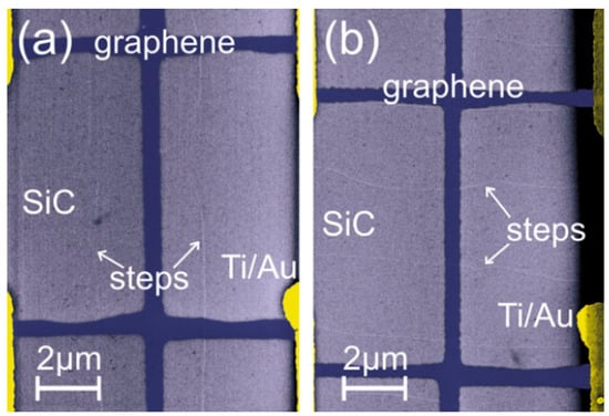 At the step edges, a second graphene layer is often formed, which is associated with step bunching and results in non-uniform graphene thickness [17] and unreliable transport measurement results [51]. S-H Ji et al. demonstrated that a strong impact of substrate steps degrades the transport properties of epitaxial graphene on SiC using scanning tunneling microscopy-based localized transport measurements [51]. Yakes et al. reported somewhat similar results noting that conductivity anisotropy in graphene was associated with substrate steps. The observed results were explained using a model where a charge build-up at the substrate steps leads to scattering [52]. For these reasons, Hall bar structures are often patterned to be parallel or perpendicular to steps (see Figure 5) to mitigate the effects of steps, and this approach was used for quantum Hall effect [53] devices. We note that Kruskopf and co-workers developed an approach to form EG on SiC(0001) that is essentially free of steps [54] and demonstrated excellent quantum Hall effect results.