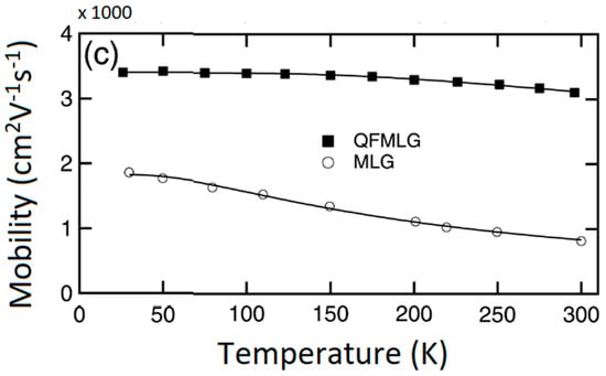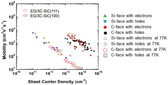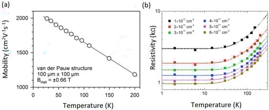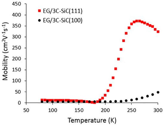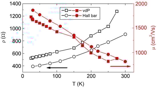 Transport measurements from the van der Pauw method deliver large scale measurements [21,55,56] and provide complete information on carrier transport in EG. vdP and Hall bar-based measurements are limited by thickness inhomogeneities and discontinuities in the epitaxial films [21,57]. Jobst et al. demonstrated that the transport properties obtained from Hall bar measurements are almost the same as those from van der Pauw measurements, as shown in Figure 6 [55].