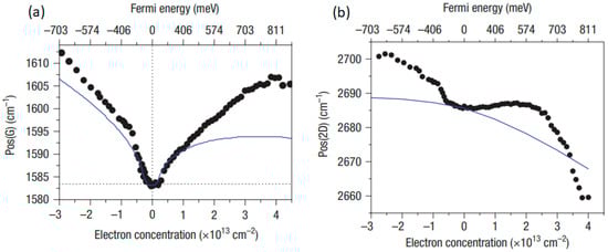 Position of the (a) G peak and (b) 2D peak as a function of electron and hole doping in graphene on SiO2. The solid blue line in (a) is the predicted non-adiabatic trend from Reference [71]. The solid line in (b) is from density functional theory calculation. Reprinted with permission from Reference [65]. Copyright (2008) Springer Nature.