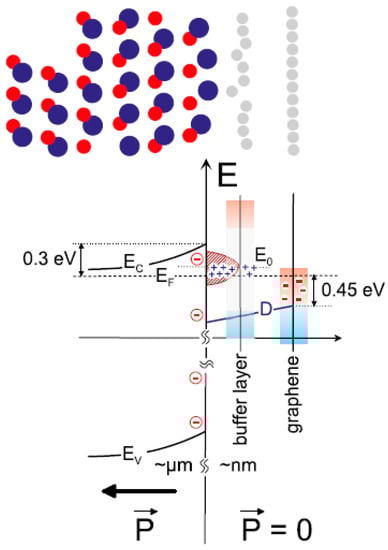 The spontaneous polarization has been reported as a bulk property of hexagonal semiconductor compounds, which leads to a polarization charge on the polar surface of SiC, independent to any interface formation [75,81]. This is induced at the inversion of the stacking sequence of the hexagonal double layers while it is absent in the 3C-SiC polytype due to the symmetry [75]. The spontaneous polarization generates a pseudo acceptor layer with a pseudo charge density (Figure 8) depending on the hexagonal polytype [75]. Ristein et al. demonstrated that the sign and magnitude of SiC polarization agree with the charge concentration of H-intercalated graphene on SiC(0001) [81]. The hexagonality of the SiC affects the polarization proportionally, i.e., for the 4H-SiC(0001) the polarization is 6/4 times larger than that for the 6H-SiC(0001) [75,81] and, as mentioned above, has been shown experimentally via the H-intercalation (Section 5.1).