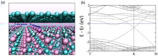 (a) EG/SiC(000) interface with the (2 × 2) C surface reconstruction. Si adatoms and C rest atoms are marked. Adapted with permission from Reference [5]. Copyright (2012) AIP Publishing. (b) Electronic band structure of EG on SiC(000 ). Adapted with permission from Reference [31]. Copyright (2007) American Physical Society.