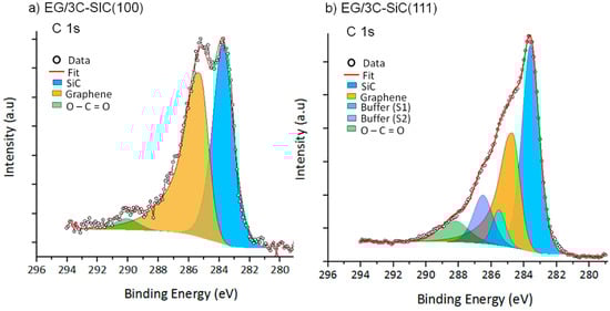 XPS C 1s core-level spectrum for (a) EG/3C-SiC (100) and (b) EG/3C-SiC (111). Buffer layer components are visible for EG/3C-SiC (111). Reprinted with permission from Reference [21]. Copyright (2020) American Chemical Society.