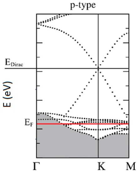 Room temperature transport measurements reported on these MEG on C-face SiC samples are typically p-type [5] with sheet density of ~1013–1014 cm−2 and mobility of ~1000–3000 cm2·V−1·s−1 even though a wide range of values and even n-type measurements have been reported [14,56,72,73,74,92]. This seems to run counter to the n-type predictions noted in Section 4.1.1, which we will address next.