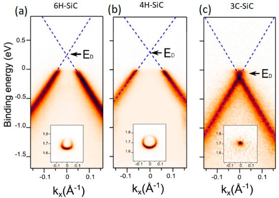 The band structure and electronic properties of EG/3C-SiC(111) determined using ARPES showed linear band dispersion K point of the Brillouin zone with the EF ~500 meV above the ED indicating n-type monolayer graphene with doping of 1013 cm−2 [19,66]. The n-type doping is also in agreement with the DFT calculations [21]. Aristov et al. [16] determined the linear band dispersion for EG/3C-SiC(100) using ARPES with the EF ~250 meV above ED, which indicated n-type doping. The absence of the buffer layer in EG on 3C-SiC(100) resulted in a weak interaction with the substrate, as evident from EF closer to ED compared to EG on 3C-SiC(111) [16].