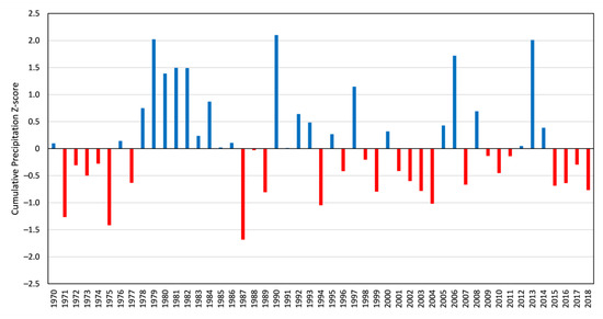 Climate data was used to avoid anomalies and assess the viability of carrying out dry-season vegetation classification and change trajectory analysis in the months from which the imagery was collected. We used two sources of historical climate data to encompass the entire time period. The Climate Hazards Group InfraRed Precipitation with Station Data (CHIRPS) from the University of California Santa Barbara is a quasi-global rainfall dataset that spans 50° S–50° N across all longitudes. CHIRPS uses 0.05° resolution satellite imagery and in-situ station data to produce a gridded, monthly dataset the spans from 1981 to near-present [32]. Since the remote sensing analysis contains the earliest usable Landsat imagery of PCNP from 1975, the CHIRPS data does not encompass the earliest part of the study period. WorldClim is another gridded dataset for historical climate data. Specifically, the CRU-TS 4.03 [31] downscaled with WorldClim 2.1 [30] is a monthly climate dataset for global land areas at approximately 21 km spatial resolution. Since this dataset provides climate data that extends back to 1960, it was used to extend our climate data back to 1970. Even though the CHIRPS and WorldClim data are at different spatial resolutions, both were used to assess the climate in PCNP. Based on the 49 years of combined CHIRPS and WorldClim precipitation data, the dry season (January–May) average precipitation in PCNP is approximately 498 mm and 2208 mm in the wet season [30,31,32]. Figure 2, which shows the yearly cumulative precipitation Z-scores for the CHIRPS and WorldClim data from 1970 to 2018, was used to assess which years were drier or wetter than average precipitation in PCNP to ensure that anomalous years of imagery were not chosen for analysis.