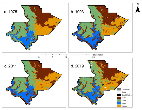 The error matrices (Table 1) show where misclassification occurred in the four images. Table 1 also shows class error commission and omission percentages, and overall accuracy and kappa coefficients. The overall accuracy for the 1975, 1993, 2011 and 2019 classifications are 88.5%, 96.9%, 96.2% and 86.1%, respectively, and the kappa statistics are 0.8402, 0.9612, 0.9474 and 0.8289. While the classifications perform well overall, some confusion, especially in the grass and wetland classes, can be noted visually. The transitional areas between grass and wetland are most well defined in the 1975 land cover classification, with each subsequent map having less definition between classes. Another issue for the SVM classifier was differentiating between spectrally similar water and cloud shadow, especially in the 2019 land cover classification; nevertheless, grouping classes together through reclassification results in new classification maps where these issues are less pronounced.