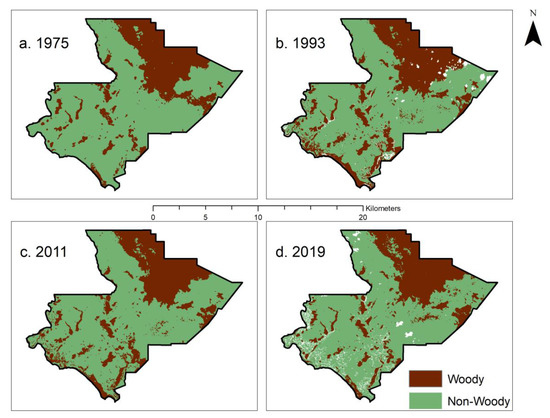 Maps showing the SVM land cover classification after reclassifying pixels as “Woody” or “Non-Woody”: (a) 1975; (b) 1993; (c) 2011; (d) 2019. White pixels represent cloud and cloud shadow, which were reclassified as no data.