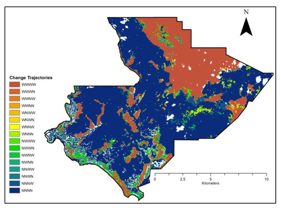 Overall change trajectory map using all four (1975, 1993, 2011, 2019) land cover classifications. Woody is “W” and non-woody is “N.” White pixels represent no data.
