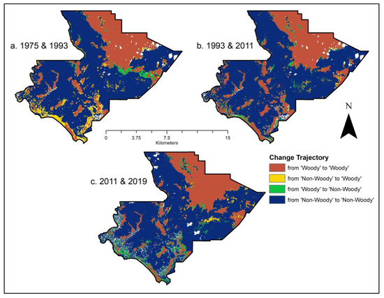 The first step for detecting conversions to and from woody and non-woody vegetation was to simplify the land cover classes. Using the “Reclassify” tool in ArcMap 10.7.1, the forest class pixels were reclassified as “Woody” while grass, wetland, and water were reclassified as “Non-Woody.” The cloud and cloud shadow pixels were reclassified to no data. After all maps were reclassified, we used the ArcMap “Raster Calculator” to create change trajectories. A change trajectory was created for all four dates to characterize overall woody and non-woody conversions in the time-series. Three additional change trajectories were created to show woody and non-woody conversion between 1975 and 1993, 1993 and 2011, and 2011 and 2019.
