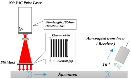 The experimental setup is shown in Figure 12. A Nd:YAG pulsed laser with a wavelength of 1064 nm and a pulse duration of 6 ns was used as the energy source. A Quantel Brilliant B pulsed YAG laser was used with principal radiation at 1064 nm, max energy/pulse 850 mJ, max average power 7.5 W, and pulse duration 6 ns. This laser beam was expanded and illuminated on a slit mask. The slit mask is located close to the specimen surface to suppress the diffraction phenomena.