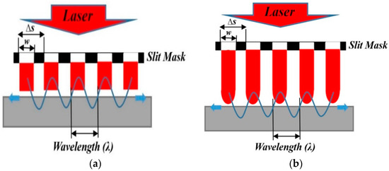 As shown in Figure 10b, the generated wave should be analyzed by using a Gaussian model. Specifically, the spatial energy profile of each line beam is assumed as Gaussian. A Gaussian model is also suitable for the focused laser beams. However, the diffraction effect is negligible when the slit mask is very close to the target surface. Then, the spatial energy profile of each line beam is closer to a square pulse than Gaussian in the line-arrayed slit mask shown in Figure 10a. The energy of each line laser beam can be assumed to have a uniform distribution, and the temporal profile is a delta function. The spatial energy profile of each line beam can be taken as a simple one-dimensional square pulse. For an array of N equally spaced identical laser sources, the final displacement can be taken as a summation of N single-source surface waves displaced in time by the surface wave propagation interval between two adjacent sources, as shown in Equation (5).
