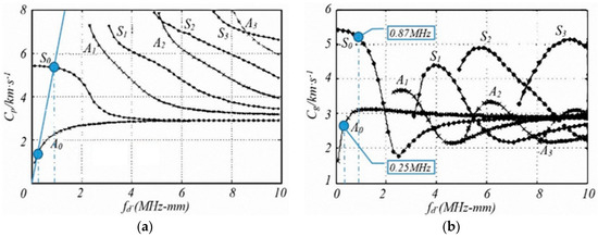 In the above equation, and is the out-of-plane displacement of the guided wave generated by a single line laser source. It is expressed as a function of time in the thermoelastic regime. The displacement is proportional to the derivative of the absorbed laser energy function. The energy distribution of the line laser beams was regarded as a square pulse, and can be approximated by the square pulse derivative. The relationship between the Lamb wave frequency dispersion curve and the corresponding parameters is given in Figure 11.