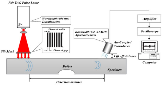 It is well known that Lamb waves can propagate long distances with little energy loss. Lamb waves have been shown to be sensitive to most types of defects. They are also efficient for detecting tiny subsurface damages and inspecting large areas. Such noncontact nondestructive testing (NDT) methods have great advantages for online inspection because high temperature or other negative factors can restrict the application of contact methods. In earlier research, ultrasonic Rayleigh and Lamb waves were used to reconstruct images in metal plates using water immersion techniques [1]. Other studies have used electromagnetic acoustic transducer (EMAT)-based methods [2,3,4] and contact techniques [5,6,7,8,9]. Air-coupled transducers have been used for tomography imaging since the end of the last century [10]. The application of purely air-coupled transducers has always been limited for the detection of nonmetallic materials [11,12] due to the high acoustic impedance between air and solid materials. Other methods, such as disc sensors, have also been widely used for the detection of metallic materials [13], but those methods are not truly noncontact methods. The research team of Rymantas J. K. developed PMN-PT synthesized with lead magnesium niobate–lead titanate crystals, and applied PMN-PT, which has a strong piezoelectric effect, to an air-coupled transducer to improve performance [14,15]. Therefore, it is believed that the hybrid application of a pulse laser and air-coupled transducer will have good performance as a fully noncontact detection system [16,17].