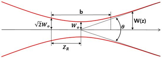 Here, is the wave number, and the gauss beam moves in the +z direction, so the beam width widens and the phase changes, so if in Equation (8) is defined as plural, can be defined by considering Figure 13. Referring to Figure 13, has the smallest beam width , so measurement is possible. That is, since Wo is half the beam width, is also determined by . is called Rayleigh length, and is increased by times at , and the position of , which is doubled by the area of the beam, becomes Rayleigh length.