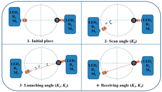 As shown in Figure 14, the scanning process consisted of four steps, and the initial condition is given in step 1. The air-coupled transducer should firstly revolve at a certain angle α around the test center when it is necessary to change the detection points. Then, the slit mask is rotated to make the wave propagation direction stay in the same straight line with the new receiving angle. This process can be very complicated with manual computation and operation. Thus, automatic control was adopted in this work. The LED laser line sources and photoresistors were installed on the edge of the slit mask and the rotation center of the air-coupled transducer. They were marked as LED1/2 and R1/2, respectively. All the automatic movement in this work is based on a step motor. To rotate the slit mask, LED1 will be turned on at the same time as the step motor M1. The illumination direction of LED1 is the same as that of the wave propagation. The step motor M1 will stop by itself once the light of LED1 points to the photoresistor R1. Then, LED2 will turn on together with M2, and the step motor M2 will also stop automatically once the light of LED2 points to the photoresistor R2. The new detection point can be fixed with the right receiving angle automatically based on the process discussed above. The complex calculations and manual operation can be omitted.