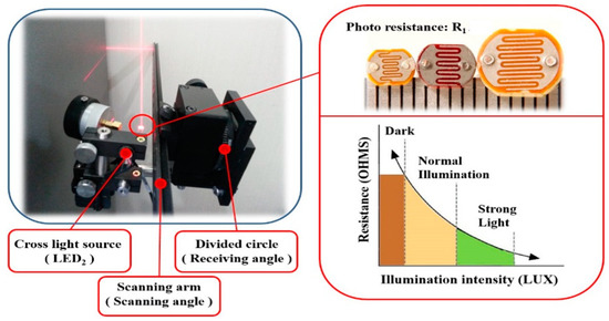 The design of the automatic scanning is shown in Figure 15. The key part here is the photoresistor. Its electrical resistance will decrease immediately if it is illuminated by the light of the laser LED. Then, the corresponding circuit that was used to control the step motor will close. Conversely, the circuit will turn off. In this work, a single chip computer was used to control the step motor. The step motor will be fixed by its magnetic pole once the circuit is controlled by the photoresistor. It can guarantee that the experimental equipment will never be influenced by potential factors from outside. In other words, the movement of the transducer can only be controlled by a program. Then, the detection points can be positioned with very high accuracy with the right receiving angle of the air-coupled transducer.