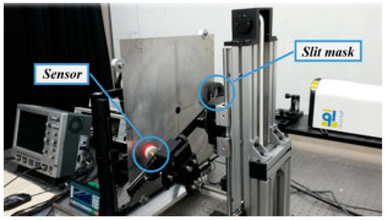 A line laser source is much better than a point source for long-range detection [33,34]. Many researchers used spatial array illumination sources produced by several means. Those methods include slit masks, lenticular arrays, optical diffraction gratings, multiple lasers, and interference patterns. The linear slit array mask was used in this study, as shown in Figure 10. A Lamb wave of specific modes can be generated selectively by adjusting the line spacing. The distance between two adjacent line laser sources is defined as the line spacing or element gap marked as . The value of the line spacing is equal to the wavelength of the generated Lamb wave. The difference between it and the element width equals the width of the single line laser source. The width of the single line light source is also known as the line width marked as w. The value of is known as the duty ratio. It is found that an A0 mode Lamb wave has the optimum signal–noise ratio when the value of is 0.5 [35].