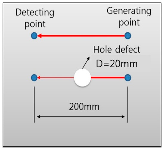 The hybrid application of an air-coupled transducer and pulse laser is used in this work. Air-coupled sensors can have increased sensitivities compared to optical transducers. Well-designed capacitive air transducers can be expected to be as sensitive as laser interferometric sensors [25,26]. In addition, the air-coupled transducers can receive a specific mode of guided waves. This can be realized by changing the receiving angle to a leak direction of the selected modes. It is well-known that a static scanning process of the receiver is very important for high-precision acquisition of the signals. The application of air-coupled transducers is one of the most appropriate choices to realize high-precision acquisition. However, the mismatch of acoustic impedances between solid materials and air is a huge weakness of a purely air-coupled transducer detection system. Consider the scenario shown in Figure 8. The ultrasound passes through the interface between the solid specimen and air two times. Only a tiny fraction (10−8) of the original acoustic energy is transmitted through both solid–air interfaces to reach the receiver.